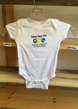 Put your little one on the path to going SOLAR PRO! This comfortable onesie is a great way to have your family show their SEI pride. Now when you sing them to sleep with the song, "You Are My Sunshine" you all fall asleep happily knowing the purchase this onesie has helped our non-profit mission and our vision of a world powered by renewable energy.